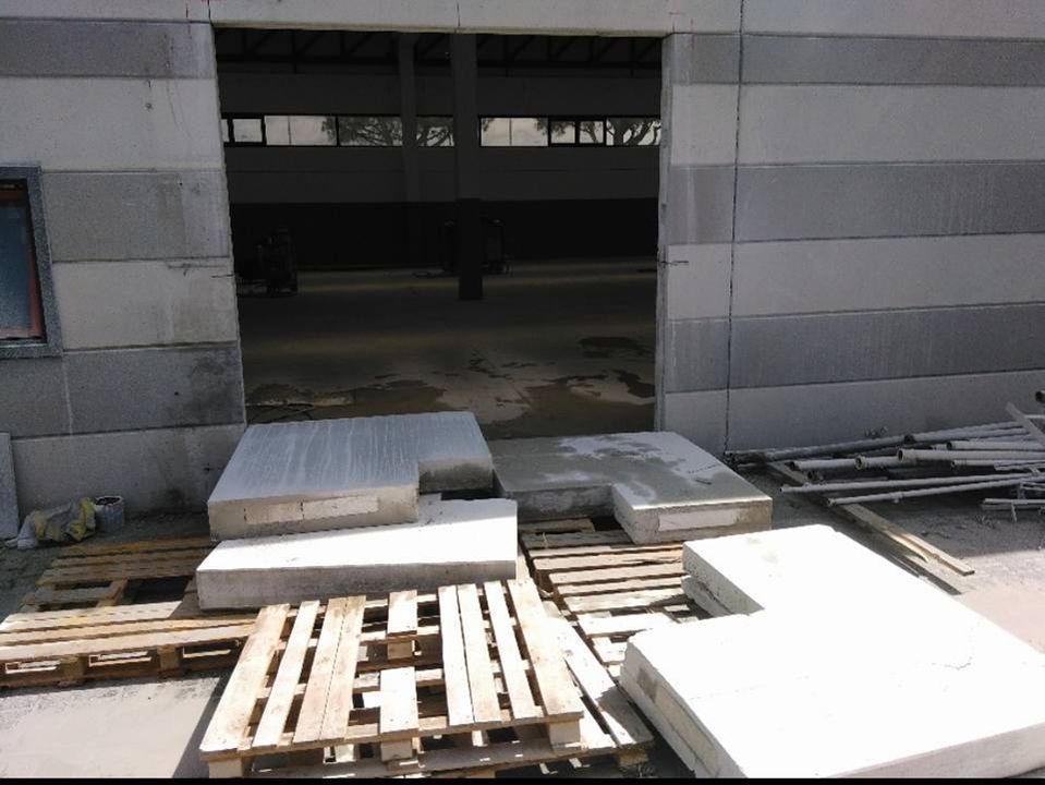 Seilsäge + Kernbohrungen an den Ecken, Abtransport in Containern.